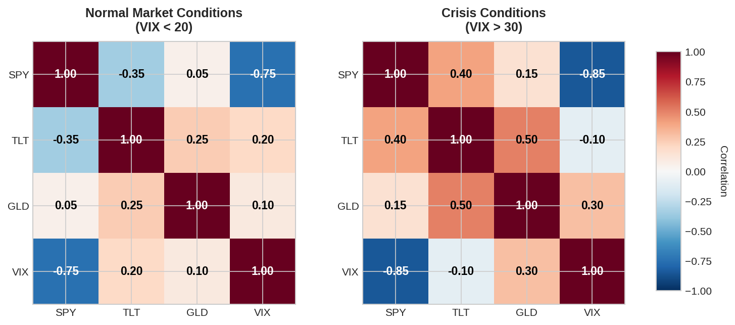 In crisis conditions, correlations converge toward +1 for risky assets and the traditional relationships break down. TLT flips from -0.35 to +0.40 correlation with SPY. Even gold becomes more correlated with equities.