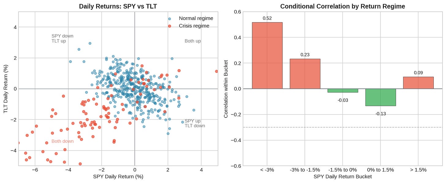 The right panel quantifies this. When SPY is down more than 3% in a day, correlation with TLT is positive. The hedge becomes a second source of loss precisely when you need protection most.