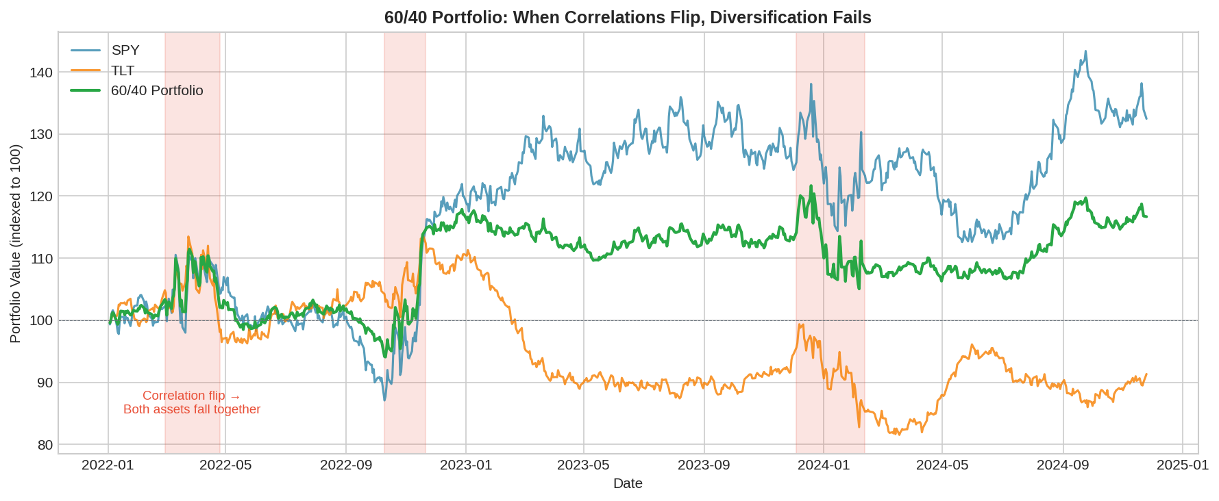 Diversification fails exactly when you need itThe shaded regions show periods where correlation flipped positive. Notice how the 60/40 portfolio (green line) fails to cushion the drawdowns. In fact, during these periods, the portfolio sometimes falls faster than SPY alone because TLT is adding to losses rather than offsetting them.