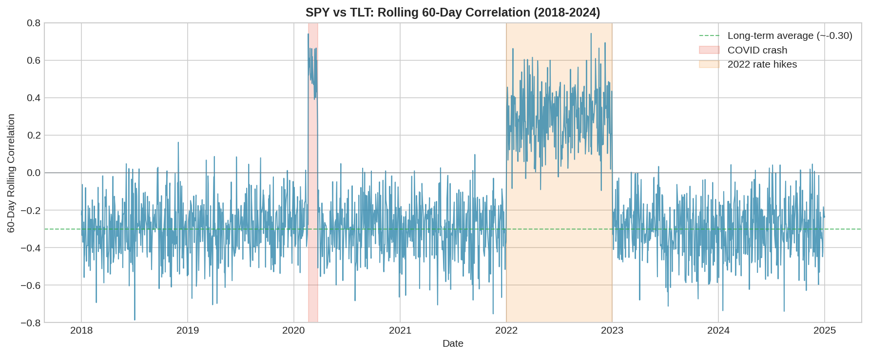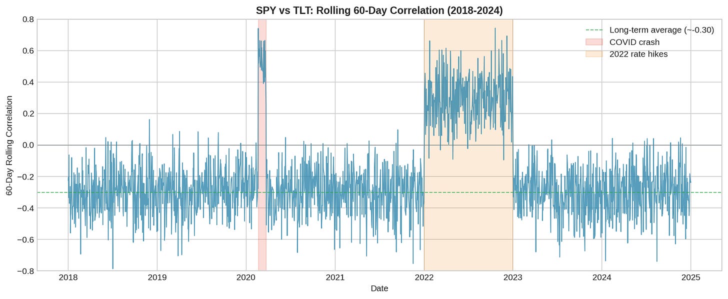 The chart above shows 60-day rolling correlation between SPY and TLT from 2018 to 2024. The long-term average hovers around -0.30, which looks great on paper. But look at what happens during the shaded periods: