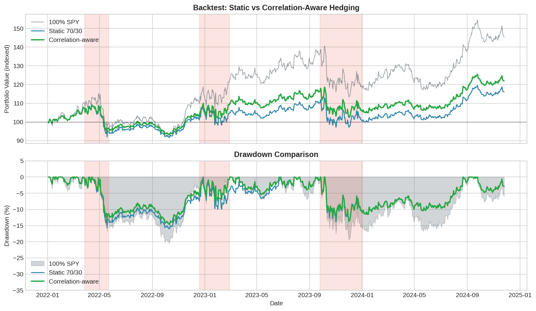 The shaded regions are the crisis periods. Notice how the static 70/30 (blue) and correlation-aware (green) diverge specifically during crises — that’s where the hedge composition difference matters.