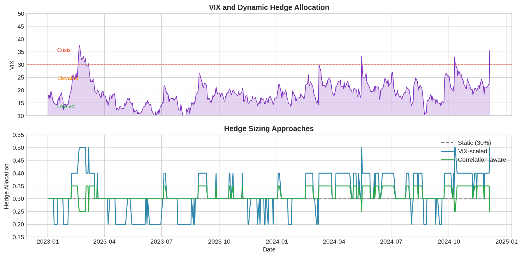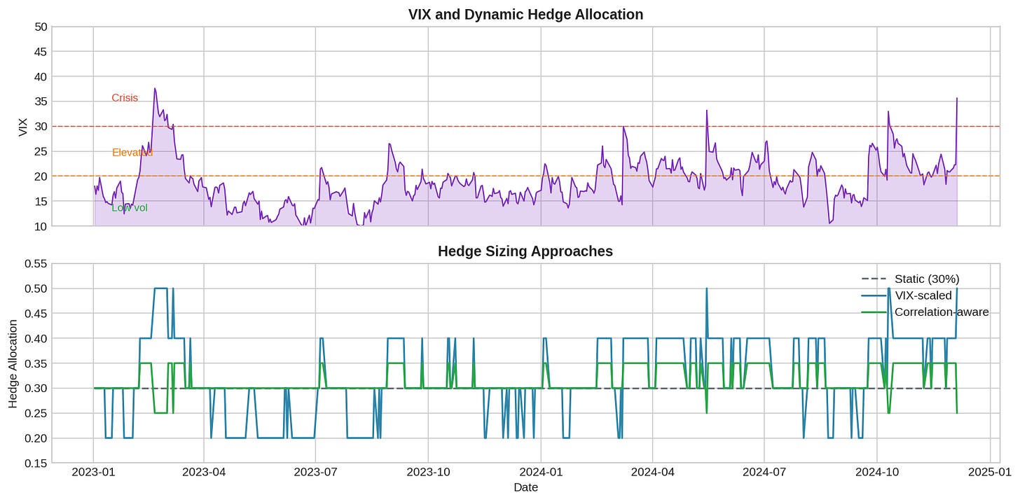 VIX-scaled (blue): Increase hedge allocation as VIX rises. Logic: higher VIX = higher risk = need more hedge. Problem: doesn’t account for correlation flip.