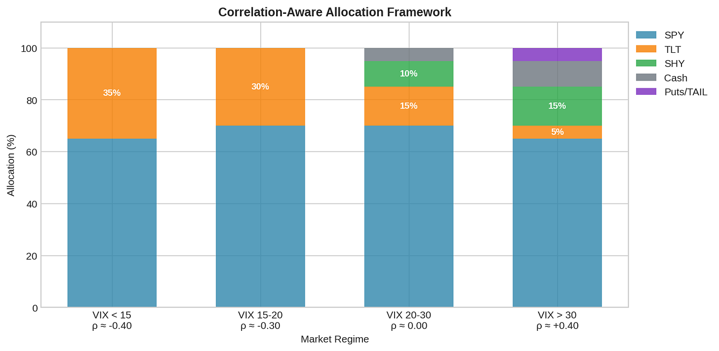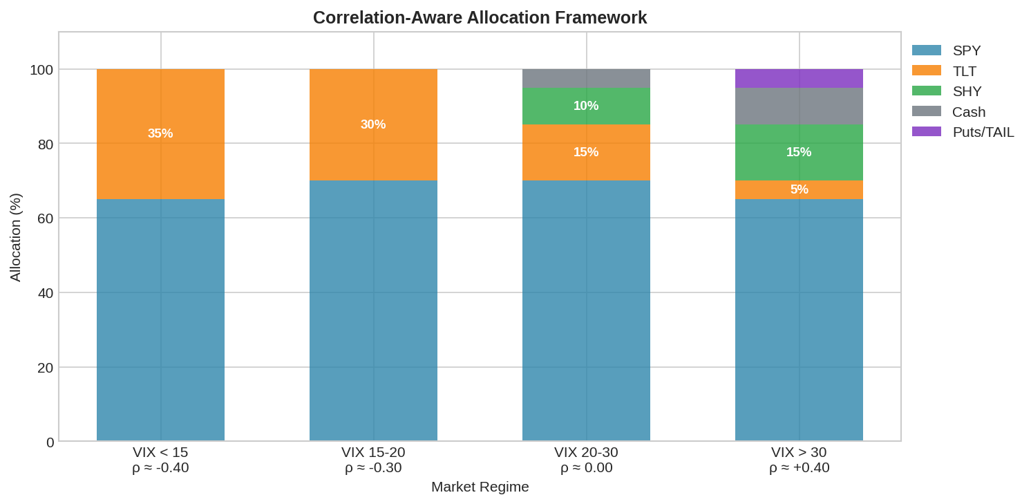 - Rationale: stability over hedging efficiencyThis is not a prediction model. It’s a regime-appropriate allocation. You’re not saying “VIX > 30 means crash coming.” You’re saying “VIX > 30 means I’m in a regime where TLT’s correlation is unreliable, so I’ll use hedges that don’t depend on correlation.”