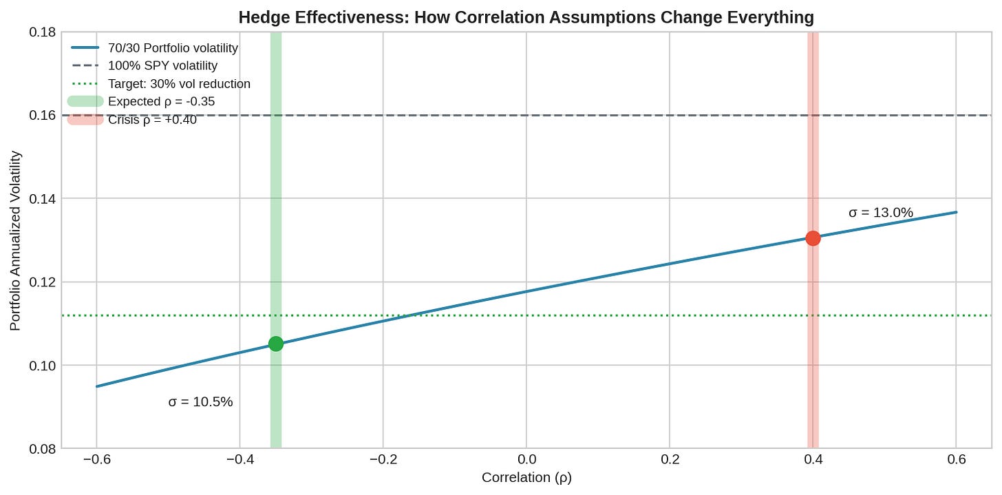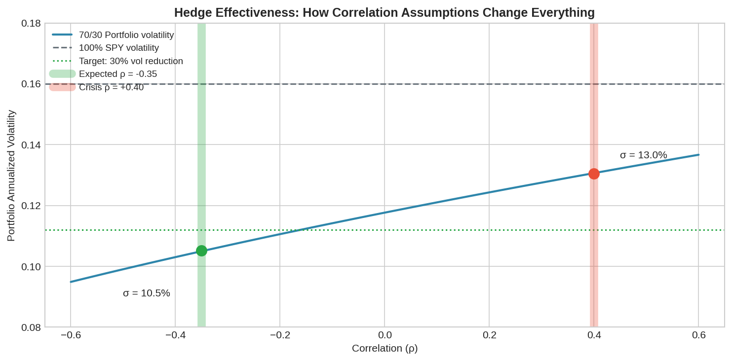The chart shows portfolio volatility as a function of correlation. The green band marks where you expect to be (ρ ≈ -0.35). The red band marks where you actually end up during crises (ρ ≈ +0.40). The difference is the hedge failing.