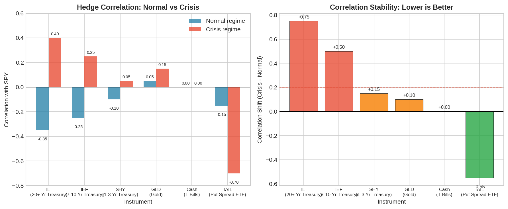 The pattern is clear: instruments that provide strong negative correlation in normal times (TLT) tend to flip during certain crises. Instruments with stable correlation (SHY, cash) don’t provide much normal-time benefit. Explicit tail hedges (puts, TAIL) are the only instruments where correlation improves during stress — but they carry substantial drag in normal times.