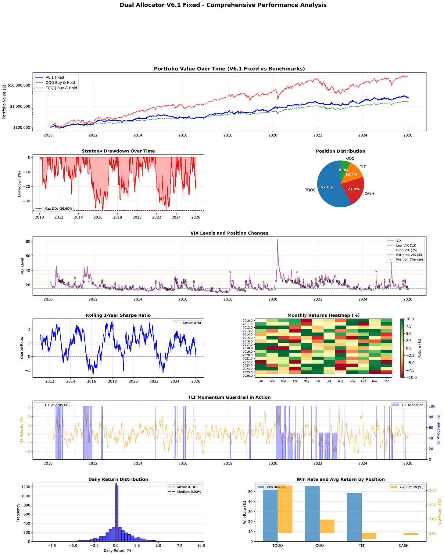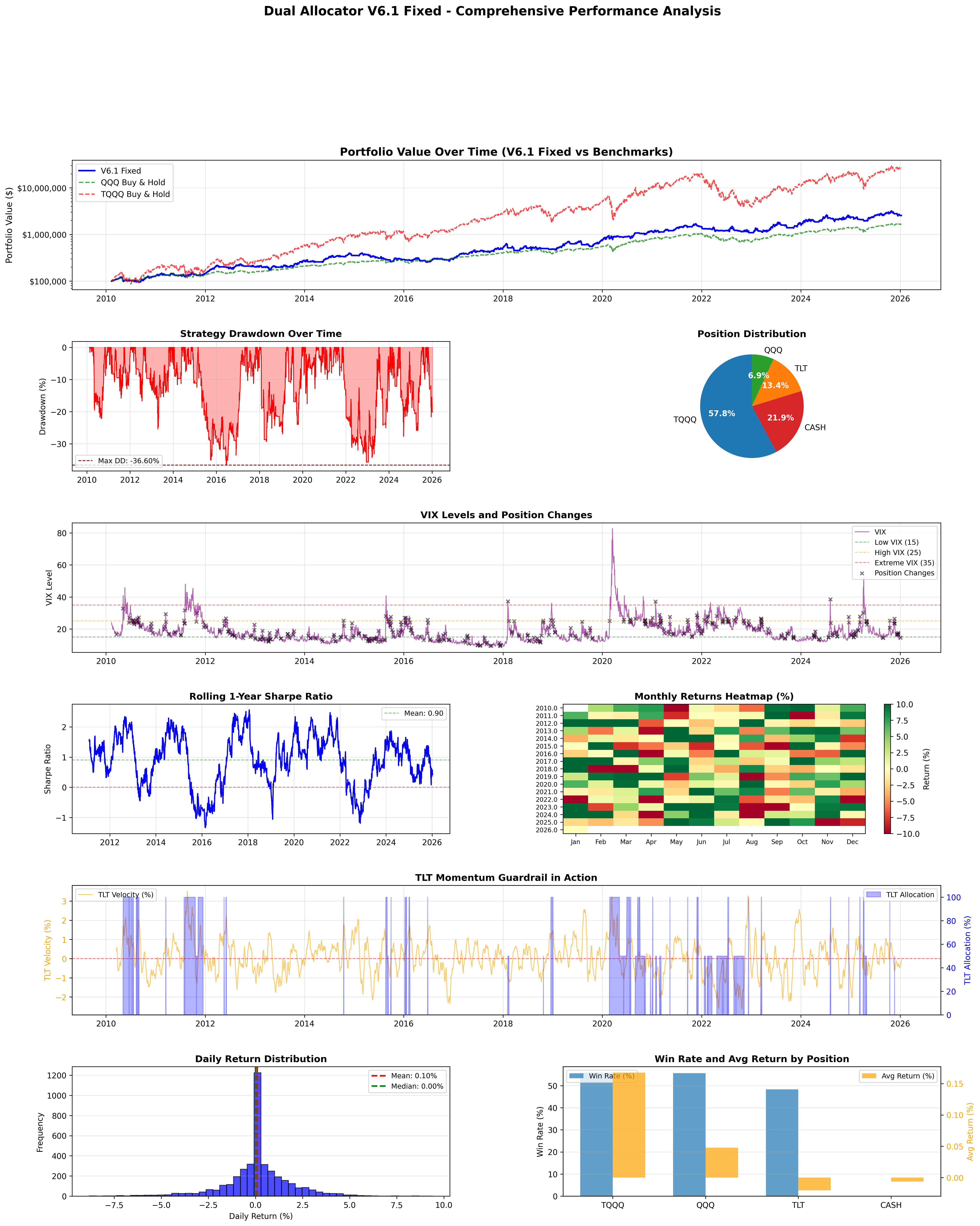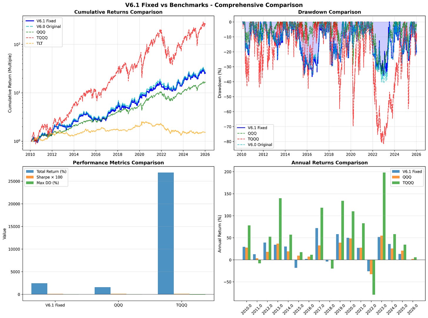 Max Drawdown -36.60% -35.12% -81.66%V6.1 sits between QQQ and TQQQ on most metrics. Higher absolute returns than QQQ, much lower drawdown than TQQQ, with Sharpe ratios in a similar range for all three.